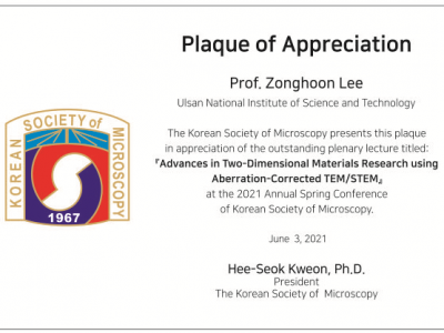 Congratulations! Prof. Zonghoon Lee received plaque of appreciation for outstanding plenary lecture in 2021 Korean Society of Microscopy Conference.